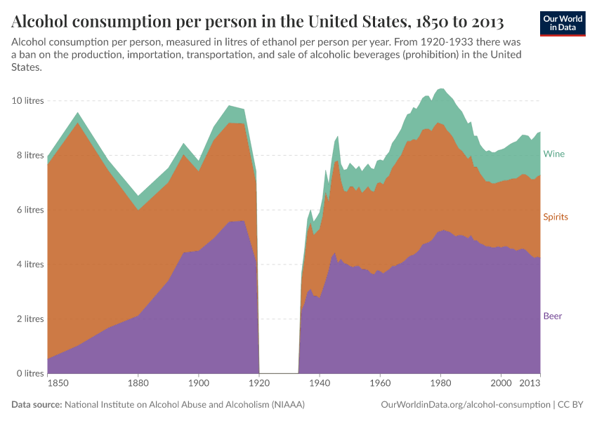 Over this long time period, we see that per capita drinking quantities have been relatively constant — typically averaging around 8 to 9 liters per year. Over the period 1920-1933, there was a ban on the production, importation, transportation, and sale of alcoholic beverages in the United States (known as the 'National Alcohol Prohibition'). Since the statistics here reflect reported sales and consumption statistics, they assume zero consumption of alcohol over this time. However, there is evidence that alcohol consumption continued through the black market and illegal sales, particularly in the sales of spirits. It's estimated that at the beginning of Prohibition, alcohol consumption decreased to approximately 30 percent of pre-prohibition levels but slowly increased to 60-70 percent by the end of the period.3