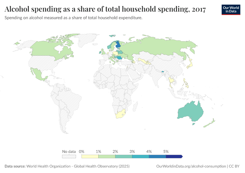 Data on alcohol expenditure is typically limited to North America, Europe, and Oceania.