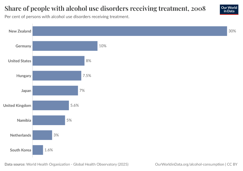 In the chart, we see data across some countries on the share of people with an alcohol use disorder who received treatment. This data is based on estimates of prevalence and treatment published by the World Health Organization (WHO).
