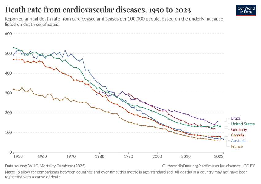 Saloni Dattani (2025) - “Death rates from cardiovascular disease have fallen dramatically — what were the breakthroughs behind this?” Published online at OurWorldinData.org. Retrieved from: 'https://update-wdi-2026-02-27.owid.pages.dev:8789/20260119-084543/cardiovascular-deaths-decline.html' [Online Resource] (archived on January 19, 2026).BibTeX citation