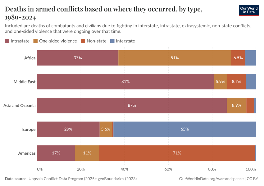 The chart shows, by region, the share of deaths each conflict type is responsible for.