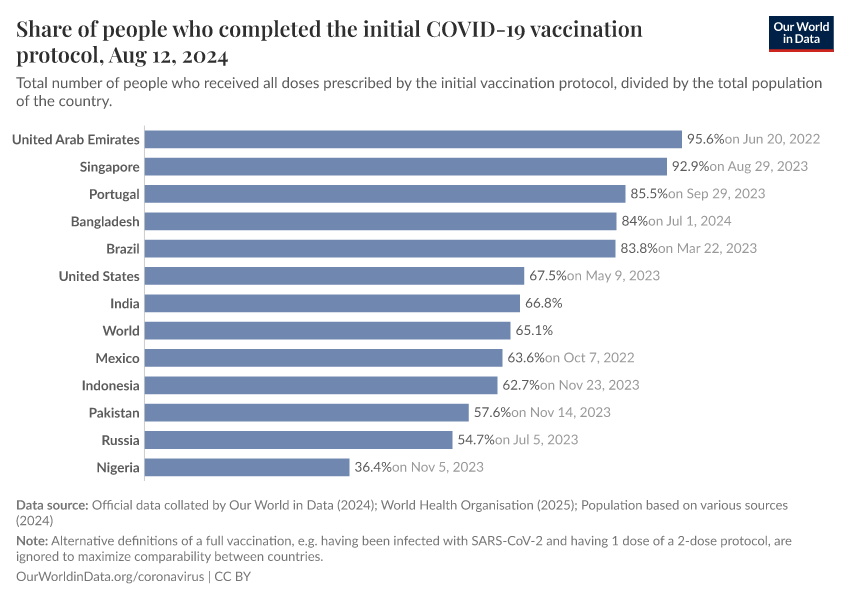 The following chart shows the share of the total population that has completed the initial vaccination protocol.