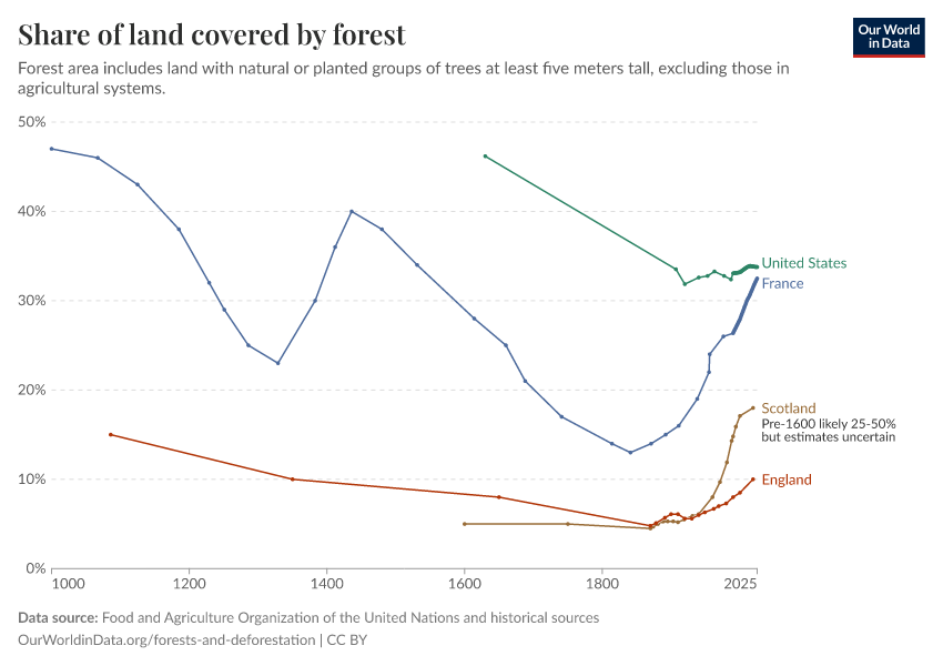 Many countries have much less forest today than they did in the past. Nearly half (47%) of France was forested 1000 years ago; today that’s just under one-third (31.4%). The same is true of the United States; back in 1630, 46% of the area of today’s USA was covered by forest. Today, that’s just 34%.