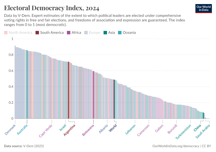 On this page, you can find data, visualizations, and writing on how democracy has spread across countries, how it differs between them, and whether we are moving towards a more democratic world.