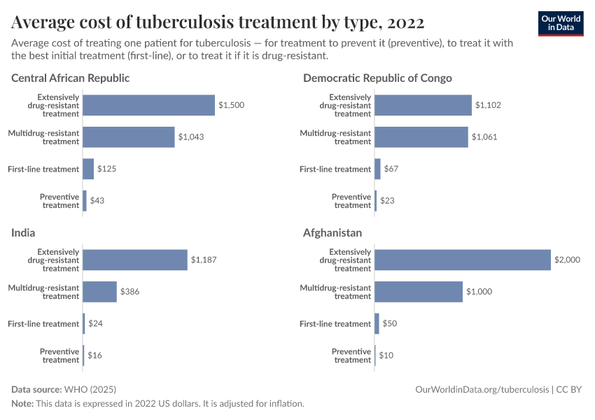 We’ve picked some of the most extreme circumstances to illustrate this: the Central African Republic is one of the poorest countries in the world. But the reality is that millions of people across low- and middle-income countries face crippling costs of TB treatment every year.12 Researchers looked at national survey data across 22 countries and found the average total cost of an episode of TB to be around $1,250.13 While we often focus on the cost of the medicine and procedures, they cost “just” $200, on average. Around $500 came from the indirect costs of travel, food, and accommodation — remember, these courses of treatment can last well over a year. Finally, another $500 came from the indirect costs of lost income from being out of work.