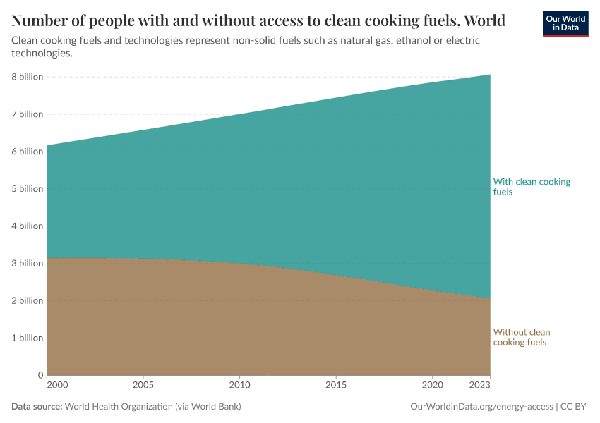 In the visualizations here, we see the number of people globally with and without clean cooking fuels and a world map of the number without access.