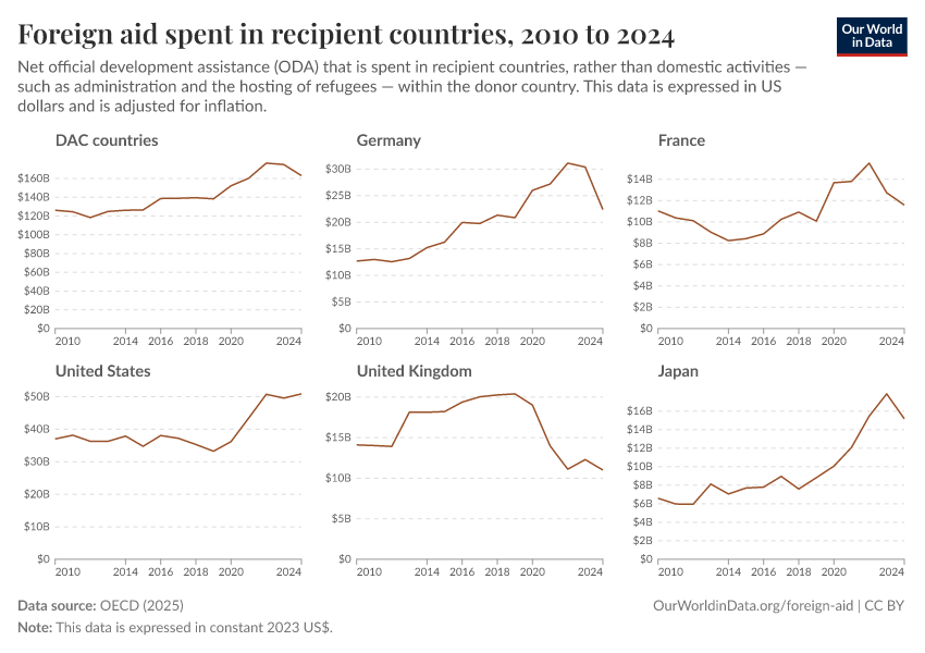 Simon van Teutem, Hannah Ritchie, and Pablo Arriagada (2025) - “How much foreign aid is spent domestically rather than overseas?” Published online at OurWorldinData.org. Retrieved from: 'https://update-wdi-2026-02-27.owid.pages.dev:8789/20260223-070107/foreign-aid-domestic-overseas.html' [Online Resource] (archived on February 23, 2026).BibTeX citation