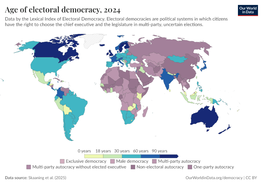 Skaaning et al. (2025) – processed by Our World in Data. “Age of electoral democracy” [dataset]. Skaaning et al., “Lexical Index of Electoral Democracy (LIED) v6.8” [original data]. Retrieved March 1, 2026 from https://update-wdi-2026-02-27.owid.pages.dev:8789/20260119-065148/grapher/age-of-electoral-democracy-lexical.html (archived on January 19, 2026).