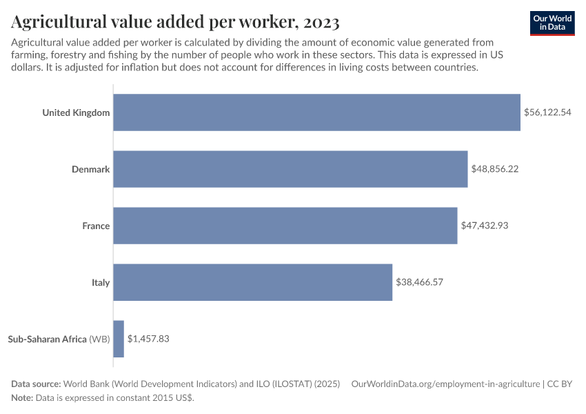 “Data Page: Agricultural value added per worker”. Our World in Data (2026). Data adapted from World Bank (World Development Indicators) and ILO (ILOSTAT). Retrieved from https://update-wdi-2026-02-27.owid.pages.dev:8789/20260129-125221/grapher/agriculture-value-added-per-worker-wdi.html [online resource] (archived on January 29, 2026).