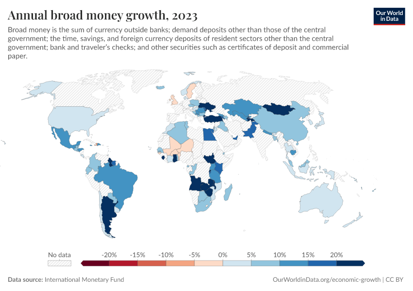 International Monetary Fund – processed by Our World in Data. “Annual broad money growth” [dataset]. International Monetary Fund, “International Monetary Fund, International Financial Statistics and data files.” [original data]. Retrieved March 1, 2026 from https://update-wdi-2026-02-27.owid.pages.dev:8789/20251120-211749/grapher/annual-broad-money-growth.html (archived on November 20, 2025).