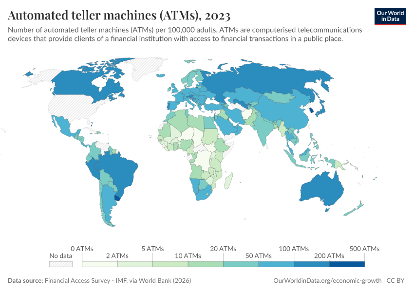 “Data Page: Automated teller machines (ATMs)”. Our World in Data (2026). Data adapted from Financial Access Survey - IMF, via World Bank. Retrieved from https://update-wdi-2026-02-27.owid.pages.dev:8789/20260202-181317/grapher/automated-teller-machines-atms-per-100000-adults.html [online resource] (archived on February 2, 2026).How to cite this data