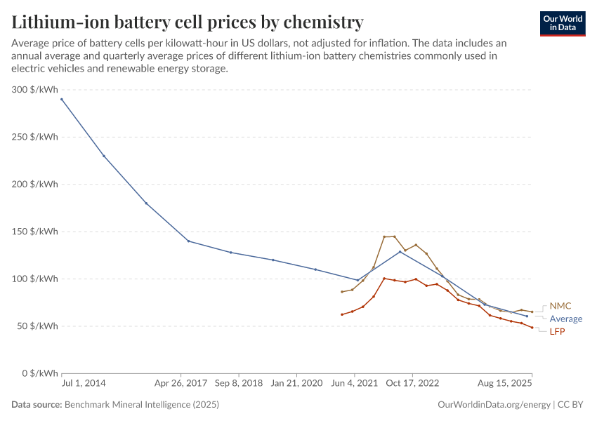 Benchmark Mineral Intelligence (2025) – with minor processing by Our World in Data. “Lithium-ion battery cell prices by chemistry” [dataset]. Benchmark Mineral Intelligence, “Lithium-ion battery prices”; Benchmark Mineral Intelligence, “Battery prices by chemistry” [original data]. Retrieved March 1, 2026 from https://update-wdi-2026-02-27.owid.pages.dev:8789/20260108-171008/grapher/average-battery-cell-price.html (archived on January 8, 2026).