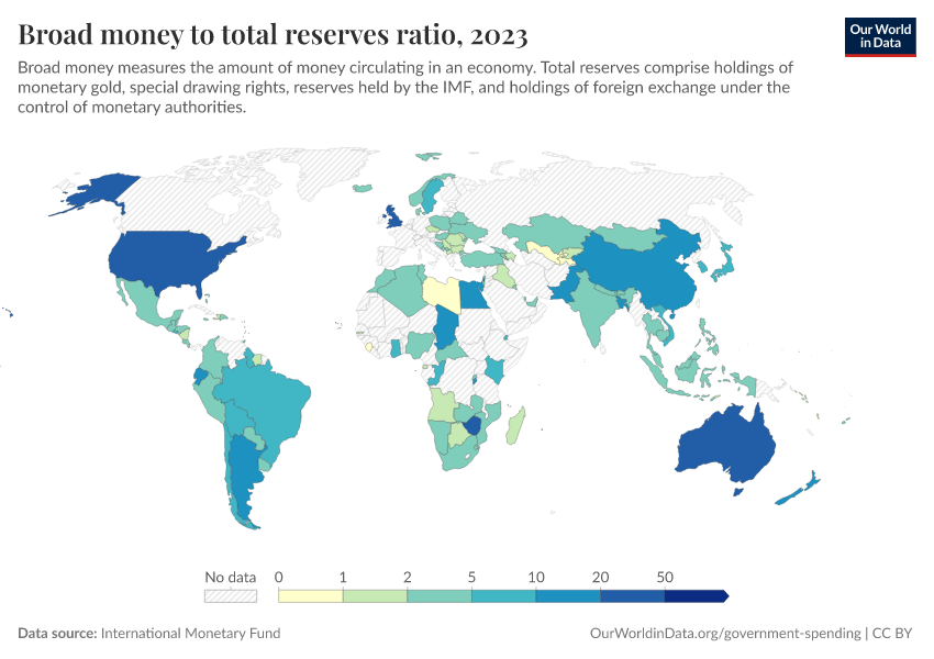 International Monetary Fund – processed by Our World in Data. “Broad money to total reserves ratio” [dataset]. International Monetary Fund, “International Monetary Fund, International Financial Statistics and data files.” [original data]. Retrieved March 1, 2026 from https://update-wdi-2026-02-27.owid.pages.dev:8789/20251120-211749/grapher/broad-money-to-total-reserves-ratio.html (archived on November 20, 2025).