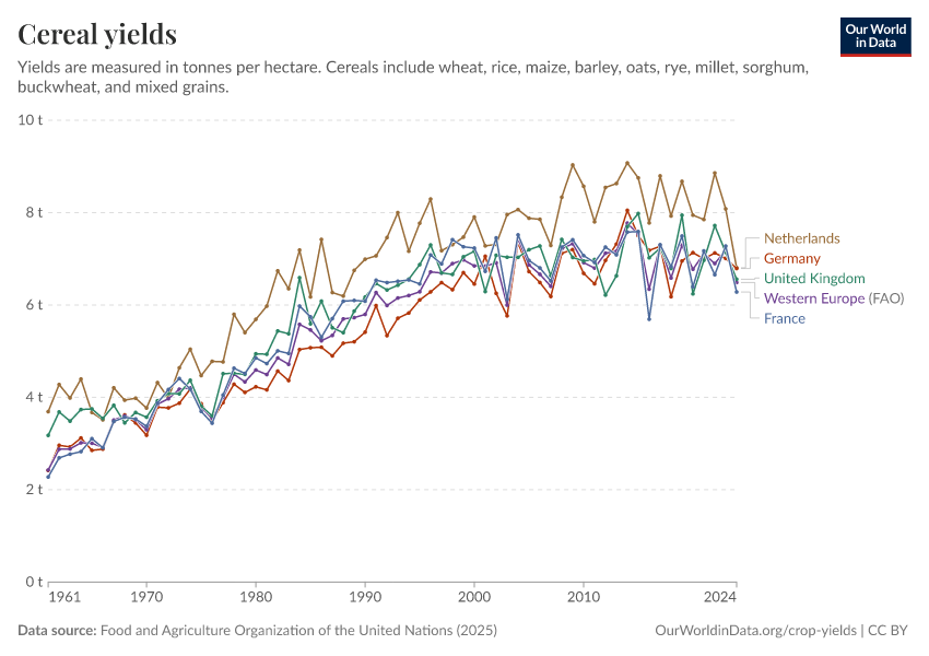 Food and Agriculture Organization of the United Nations (2025) – with major processing by Our World in Data. “Cereal yields – UN FAO” [dataset]. Food and Agriculture Organization of the United Nations, “Production: Crops and livestock products” [original data]. Retrieved March 1, 2026 from https://update-wdi-2026-02-27.owid.pages.dev:8789/20260226-122020/grapher/cereal-yield.html (archived on February 26, 2026).