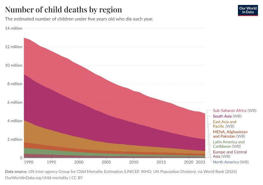 UN Inter-agency Group for Child Mortality Estimation (UNICEF, WHO, UN Population Division), via World Bank (2026) – processed by Our World in Data. “Number of child deaths by region” [dataset]. UN Inter-agency Group for Child Mortality Estimation (UNICEF, WHO, UN Population Division), via World Bank, “World Development Indicators 125” [original data]. Retrieved March 1, 2026 from https://update-wdi-2026-02-27.owid.pages.dev:8789/20260202-180243/grapher/child-deaths-igme-data.html (archived on February 2, 2026).