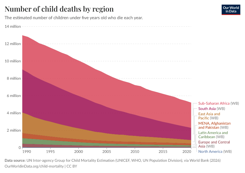 UN Inter-agency Group for Child Mortality Estimation (UNICEF, WHO, UN Population Division), via World Bank (2026) – processed by Our World in Data. “Number of child deaths by region” [dataset]. UN Inter-agency Group for Child Mortality Estimation (UNICEF, WHO, UN Population Division), via World Bank, “World Development Indicators 125” [original data]. Retrieved March 1, 2026 from https://update-wdi-2026-02-27.owid.pages.dev:8789/20260202-180243/grapher/child-deaths-igme-data.html (archived on February 2, 2026).