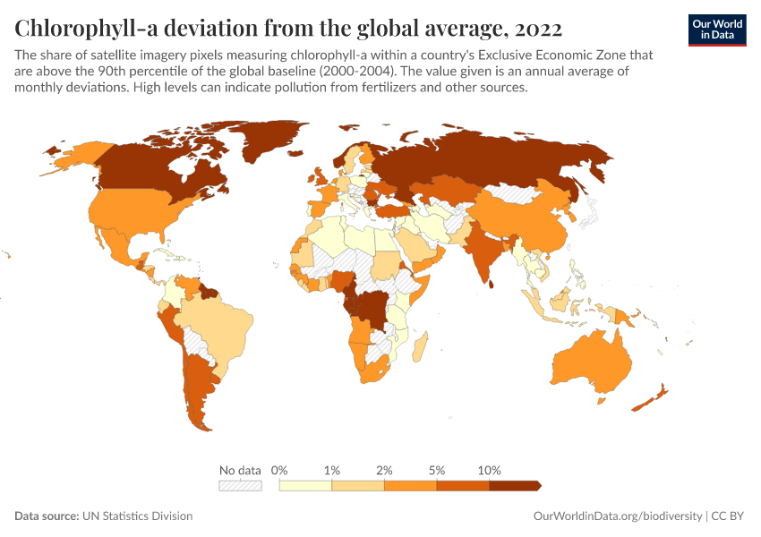 UN Statistics Division – processed by Our World in Data. “Chlorophyll-a deviation from the global average” [dataset]. UN Statistics Division, “World Environment Situation Room” [original data]. Retrieved March 1, 2026 from https://update-wdi-2026-02-27.owid.pages.dev:8789/20260130-180113/grapher/chlorophyll-a-deviation-from-the-global-average.html (archived on January 30, 2026).