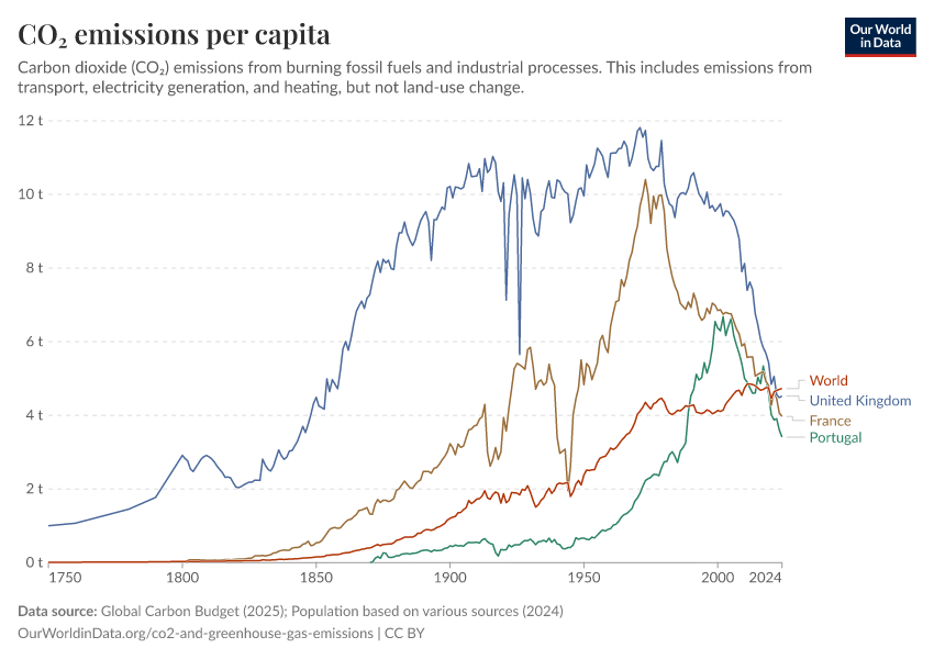 “Data Page: CO₂ emissions per capita”, part of the following publication: Hannah Ritchie, Pablo Rosado, and Max Roser (2023) - “CO₂ and Greenhouse Gas Emissions”. Data adapted from Global Carbon Project, Various sources. Retrieved from https://update-wdi-2026-02-27.owid.pages.dev:8789/20260119-070102/grapher/co-emissions-per-capita.html [online resource] (archived on January 19, 2026).