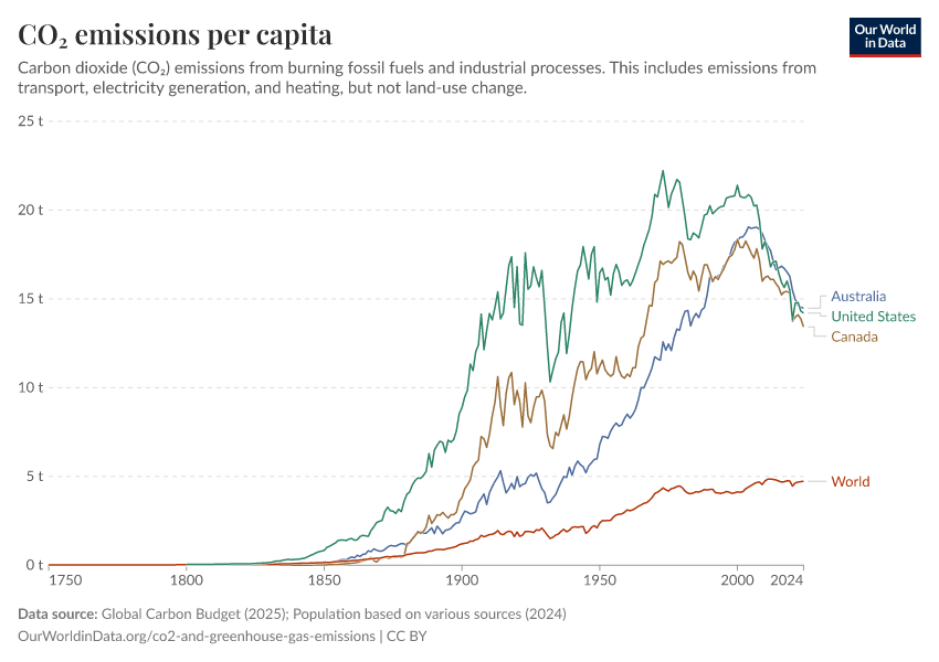 Global Carbon Budget (2025); Population based on various sources (2024) – with major processing by Our World in Data. “CO₂ emissions per capita” [dataset]. Global Carbon Project, “Global Carbon Budget v15”; Various sources, “Population” [original data]. Retrieved March 1, 2026 from https://update-wdi-2026-02-27.owid.pages.dev:8789/20260119-070102/grapher/co-emissions-per-capita.html (archived on January 19, 2026).