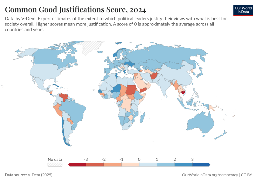 “Data Page: Common good justifications”, part of the following publication: Bastian Herre, Lucas Rodés-Guirao, and Esteban Ortiz-Ospina (2013) - “Democracy”. Data adapted from V-Dem. Retrieved from https://update-wdi-2026-02-27.owid.pages.dev:8789/20260204-170225/grapher/common-good-justifications-score.html [online resource] (archived on February 4, 2026).How to cite this data