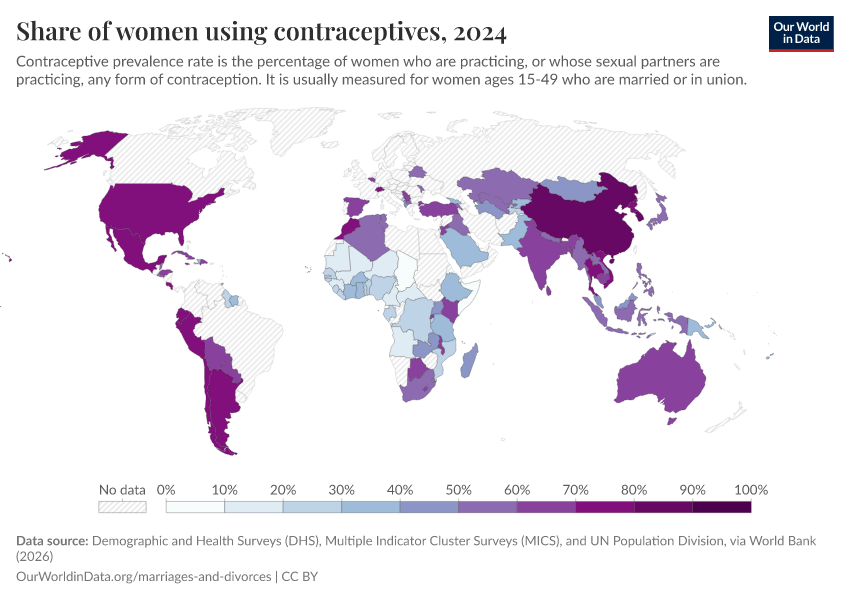 “Data Page: Share of women using contraceptives”. Our World in Data (2026). Data adapted from Demographic and Health Surveys (DHS), Multiple Indicator Cluster Surveys (MICS), and UN Population Division, via World Bank. Retrieved from https://update-wdi-2026-02-27.owid.pages.dev:8789/20260202-181317/grapher/contraceptive-prevalence-any-methods-of-women-ages-15-49.html [online resource] (archived on February 2, 2026).How to cite this data
