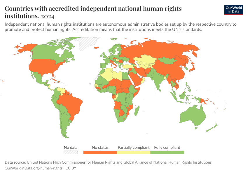 “Data Page: Countries with accredited independent national human rights institutions”. Our World in Data (2026). Data adapted from United Nations High Commissioner for Human Rights and Global Alliance of National Human Rights Institutions. Retrieved from https://update-wdi-2026-02-27.owid.pages.dev:8789/20251120-211038/grapher/countries-with-independent-national-human-rights-institution.html [online resource] (archived on November 20, 2025).How to cite this data