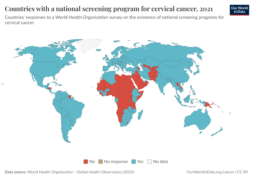 “Data Page: Countries with a national screening program for cervical cancer”. Our World in Data (2026). Data adapted from World Health Organization. Retrieved from https://update-wdi-2026-02-27.owid.pages.dev:8789/20260224-141219/grapher/countries-with-national-cervical-cancer-screening-program.html [online resource] (archived on February 24, 2026).How to cite this data