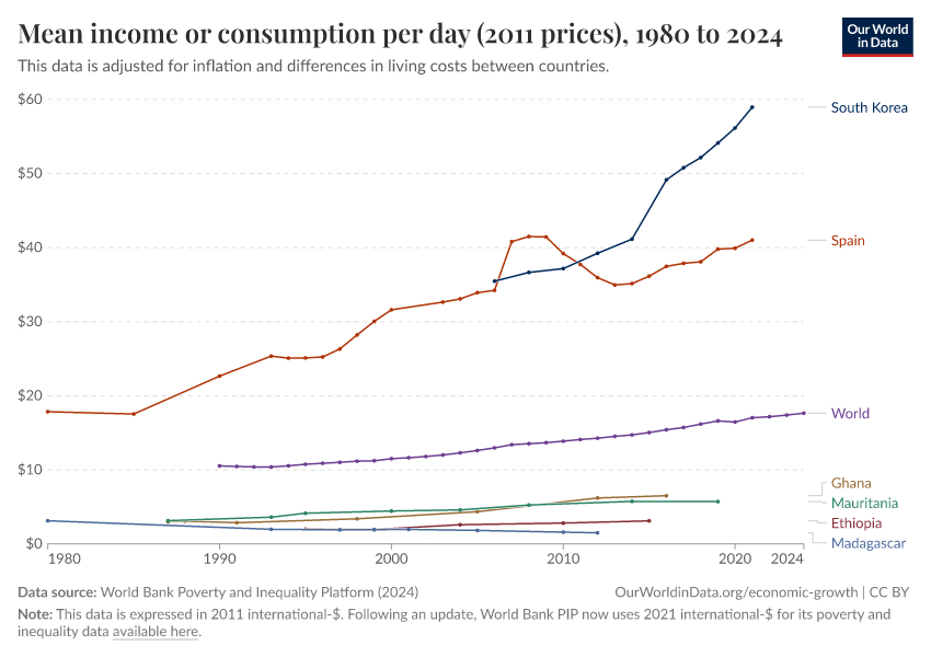 World Bank Poverty and Inequality Platform (2024) – with major processing by Our World in Data. “Mean income or consumption per day (2011 prices) – World Bank” [dataset]. World Bank Poverty and Inequality Platform, “World Bank Poverty and Inequality Platform (PIP) 20240627_2017, 20240627_2011” [original data]. Retrieved March 1, 2026 from https://update-wdi-2026-02-27.owid.pages.dev:8789/20251022-091218/grapher/daily-mean-income-2011-ppp.html (archived on October 22, 2025).