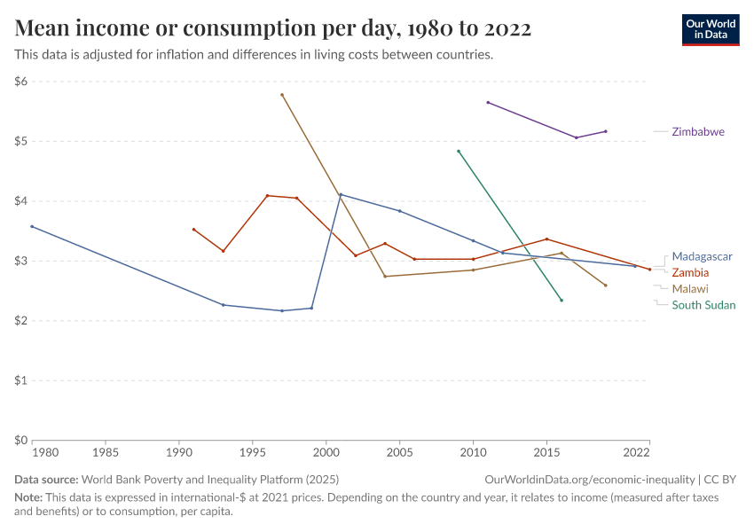 World Bank Poverty and Inequality Platform (2025) – with major processing by Our World in Data. “Mean income or consumption per day – World Bank” [dataset]. World Bank Poverty and Inequality Platform, “World Bank Poverty and Inequality Platform (PIP) 20250930_2021, 20250930_2017” [original data]. Retrieved March 1, 2026 from https://update-wdi-2026-02-27.owid.pages.dev:8789/20260127-114142/grapher/daily-mean-income.html (archived on January 27, 2026).