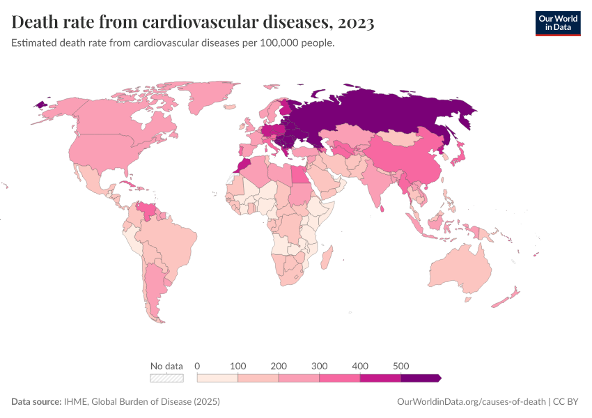 IHME, Global Burden of Disease (2025) – with major processing by Our World in Data. “Death rate from cardiovascular diseases” [dataset]. IHME, Global Burden of Disease, “Global Burden of Disease - Deaths” [original data]. Retrieved March 1, 2026 from https://update-wdi-2026-02-27.owid.pages.dev:8789/20260211-174736/grapher/death-rate-from-cardiovascular-diseases.html (archived on February 11, 2026).
