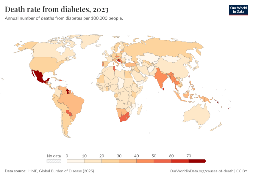 “Data Page: Death rate from diabetes”, part of the following publication: Esteban Ortiz-Ospina and Max Roser (2016) - “Global Health”. Data adapted from IHME, Global Burden of Disease. Retrieved from https://update-wdi-2026-02-27.owid.pages.dev:8789/20260211-174736/grapher/death-rate-from-diabetes-gbd.html [online resource] (archived on February 11, 2026).How to cite this data