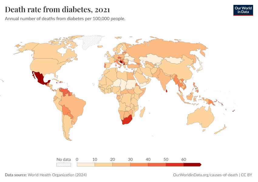 World Health Organization (2024) – with major processing by Our World in Data. “Death rate from diabetes” [dataset]. World Health Organization, “Global Health Estimates” [original data]. Retrieved March 1, 2026 from https://update-wdi-2026-02-27.owid.pages.dev:8789/20250909-093708/grapher/death-rate-from-diabetes-ghe.html (archived on September 9, 2025).