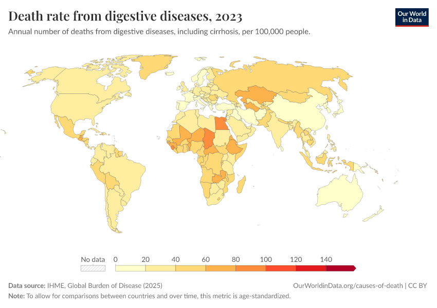 IHME, Global Burden of Disease (2025) – with major processing by Our World in Data. “Death rate from digestive diseases” [dataset]. IHME, Global Burden of Disease, “Global Burden of Disease - Deaths” [original data]. Retrieved March 1, 2026 from https://update-wdi-2026-02-27.owid.pages.dev:8789/20260211-174736/grapher/death-rate-from-digestive-diseases.html (archived on February 11, 2026).