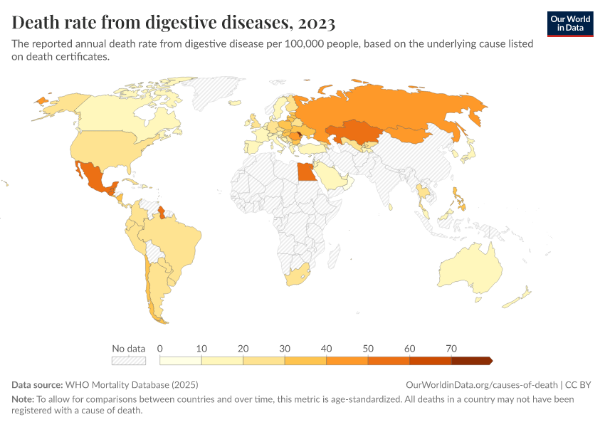 “Data Page: Death rate from digestive diseases”, part of the following publication: Saloni Dattani, Fiona Spooner, Hannah Ritchie, and Max Roser (2023) - “Causes of Death”. Data adapted from WHO Mortality Database. Retrieved from https://update-wdi-2026-02-27.owid.pages.dev:8789/20250909-093708/grapher/death-rate-from-digestive-diseases-who-mdb.html [online resource] (archived on September 9, 2025).How to cite this data