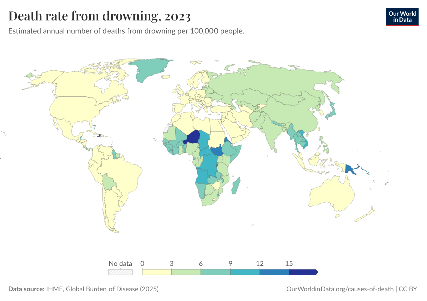 IHME, Global Burden of Disease (2025) – with major processing by Our World in Data. “Death rate from drowning” [dataset]. IHME, Global Burden of Disease, “Global Burden of Disease - Deaths” [original data]. Retrieved March 1, 2026 from https://update-wdi-2026-02-27.owid.pages.dev:8789/20260211-174736/grapher/death-rate-from-drowning.html (archived on February 11, 2026).