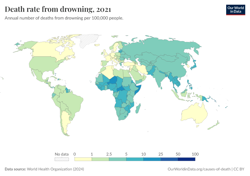World Health Organization (2024) – with major processing by Our World in Data. “Death rate from drowning” [dataset]. World Health Organization, “Global Health Estimates” [original data]. Retrieved March 1, 2026 from https://update-wdi-2026-02-27.owid.pages.dev:8789/20250909-093708/grapher/death-rate-from-drowning-ghe.html (archived on September 9, 2025).