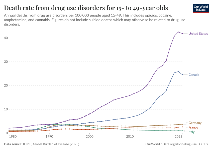 IHME, Global Burden of Disease (2025) – with major processing by Our World in Data. “Death rate from drug use disorders for 15- to 49-year olds” [dataset]. IHME, Global Burden of Disease, “Global Burden of Disease - Deaths” [original data]. Retrieved March 1, 2026 from https://update-wdi-2026-02-27.owid.pages.dev:8789/20260211-174736/grapher/death-rate-from-drug-use-disorders-for-15--to-49-year-olds.html (archived on February 11, 2026).