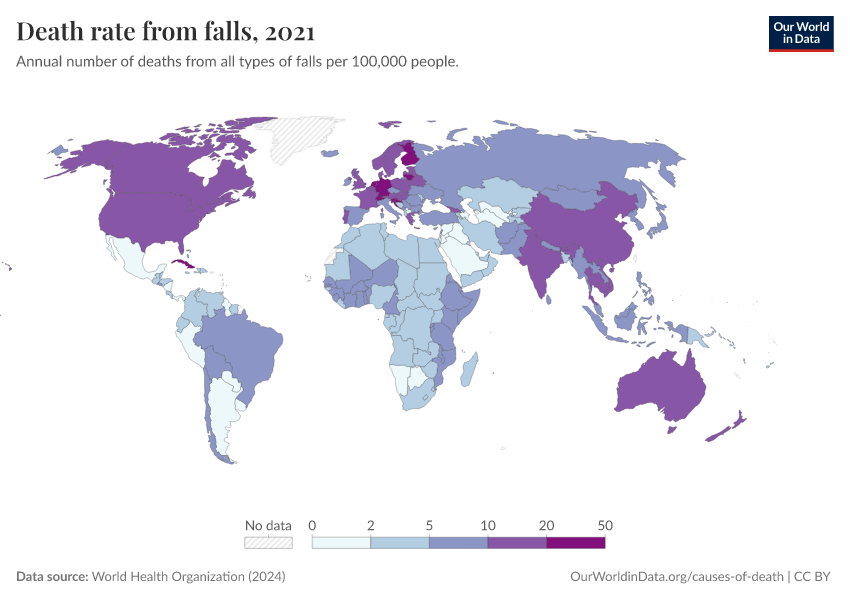 World Health Organization (2024) – with major processing by Our World in Data. “Death rate from falls” [dataset]. World Health Organization, “Global Health Estimates” [original data]. Retrieved March 1, 2026 from https://update-wdi-2026-02-27.owid.pages.dev:8789/20250909-093708/grapher/death-rate-from-falls.html (archived on September 9, 2025).
