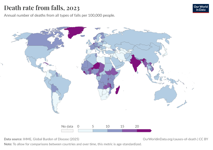 IHME, Global Burden of Disease (2025) – with major processing by Our World in Data. “Death rate from falls” [dataset]. IHME, Global Burden of Disease, “Global Burden of Disease - Deaths” [original data]. Retrieved March 1, 2026 from https://update-wdi-2026-02-27.owid.pages.dev:8789/20260211-174736/grapher/death-rate-from-falls-gbd.html (archived on February 11, 2026).