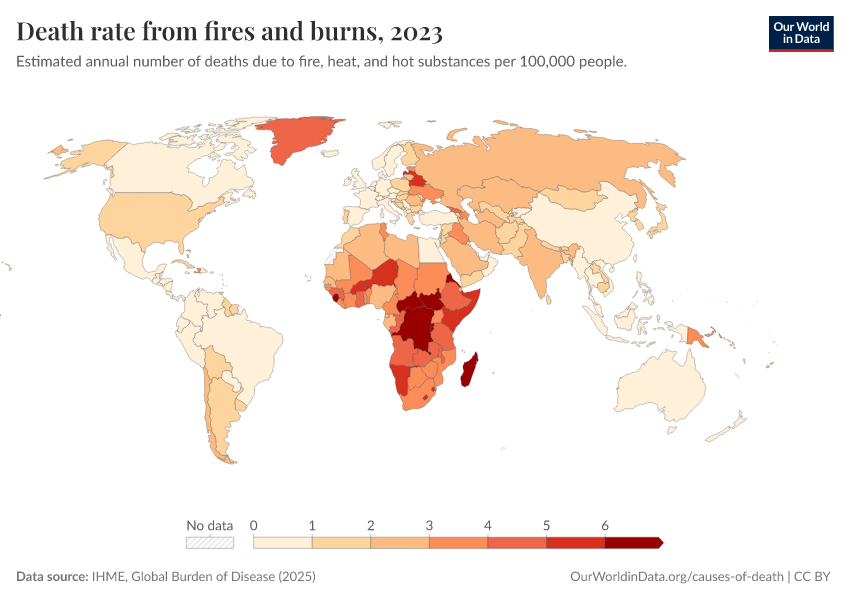 IHME, Global Burden of Disease (2025) – with major processing by Our World in Data. “Death rate from fires and burns” [dataset]. IHME, Global Burden of Disease, “Global Burden of Disease - Deaths” [original data]. Retrieved March 1, 2026 from https://update-wdi-2026-02-27.owid.pages.dev:8789/20260211-174736/grapher/death-rate-from-fires-and-burns-ihme.html (archived on February 11, 2026).