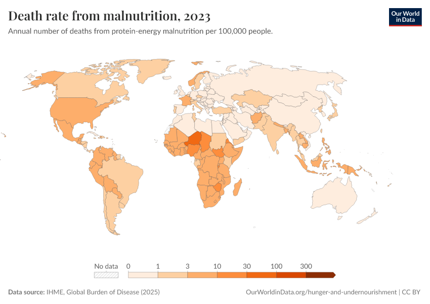 IHME, Global Burden of Disease (2025) – with major processing by Our World in Data. “Death rate from malnutrition” [dataset]. IHME, Global Burden of Disease, “Global Burden of Disease - Deaths” [original data]. Retrieved March 1, 2026 from https://update-wdi-2026-02-27.owid.pages.dev:8789/20260211-174736/grapher/death-rate-from-malnutrition.html (archived on February 11, 2026).