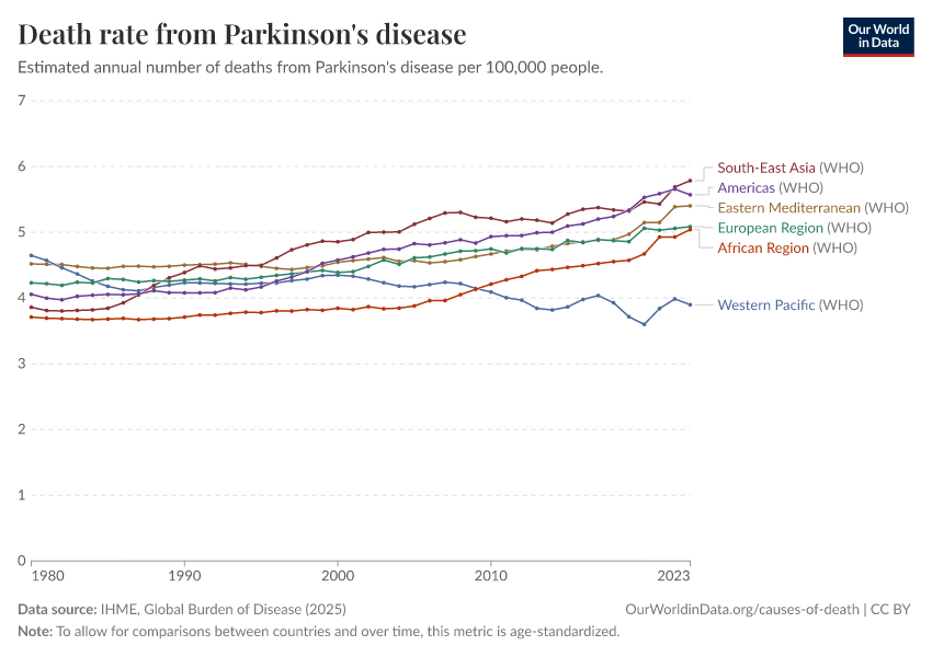 IHME, Global Burden of Disease (2025) – with major processing by Our World in Data. “Death rate from Parkinson's disease” [dataset]. IHME, Global Burden of Disease, “Global Burden of Disease - Deaths” [original data]. Retrieved March 1, 2026 from https://update-wdi-2026-02-27.owid.pages.dev:8789/20260211-174736/grapher/death-rate-from-parkinsons-disease.html (archived on February 11, 2026).