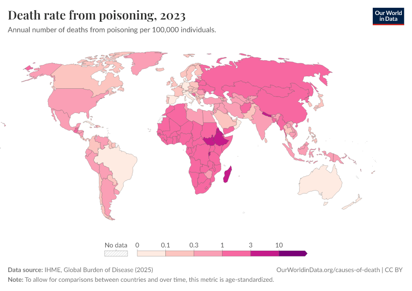IHME, Global Burden of Disease (2025) – with major processing by Our World in Data. “Death rate from poisoning” [dataset]. IHME, Global Burden of Disease, “Global Burden of Disease - Deaths” [original data]. Retrieved March 1, 2026 from https://update-wdi-2026-02-27.owid.pages.dev:8789/20260211-174736/grapher/death-rate-from-poisoning.html (archived on February 11, 2026).