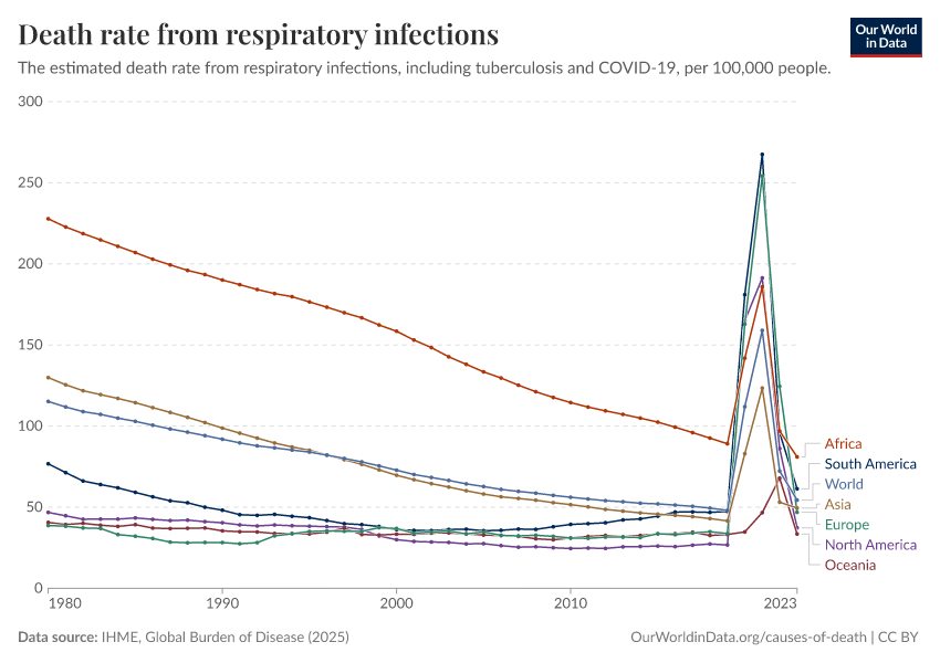 IHME, Global Burden of Disease (2025) – with major processing by Our World in Data. “Death rate from respiratory infections” [dataset]. IHME, Global Burden of Disease, “Global Burden of Disease - Deaths” [original data]. Retrieved March 1, 2026 from https://update-wdi-2026-02-27.owid.pages.dev:8789/20260211-174736/grapher/death-rate-from-respiratory-infections-gbd.html (archived on February 11, 2026).