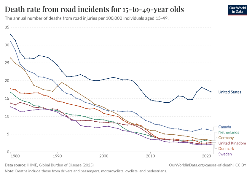 IHME, Global Burden of Disease (2025) – with major processing by Our World in Data. “Death rate from road incidents for 15-to-49-year olds” [dataset]. IHME, Global Burden of Disease, “Global Burden of Disease - Deaths” [original data]. Retrieved March 1, 2026 from https://update-wdi-2026-02-27.owid.pages.dev:8789/20260211-174736/grapher/death-rate-from-road-accidents-for-15--to-49-year-olds.html (archived on February 11, 2026).