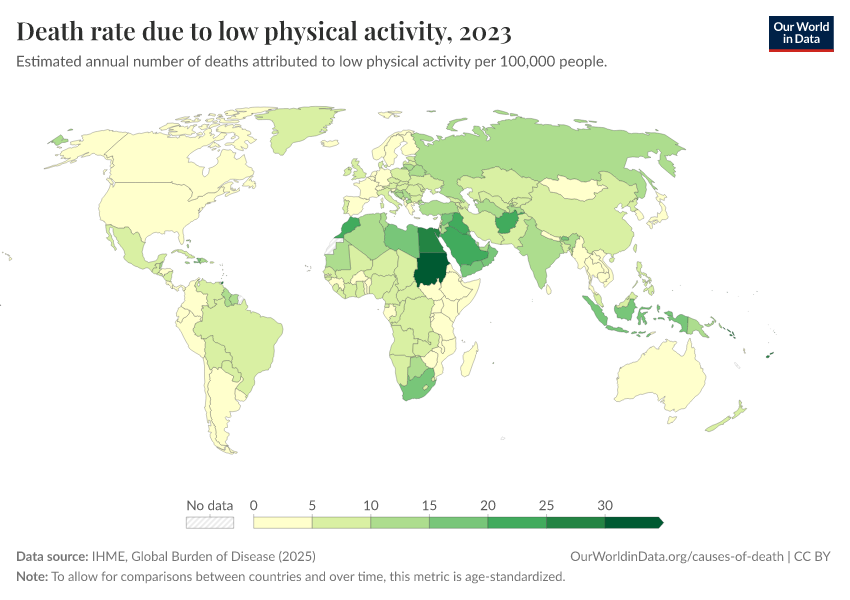 IHME, Global Burden of Disease (2025) – with major processing by Our World in Data. “Death rate due to low physical activity” [dataset]. IHME, Global Burden of Disease, “Global Burden of Disease - Risk Factors - Deaths” [original data]. Retrieved March 1, 2026 from https://update-wdi-2026-02-27.owid.pages.dev:8789/20260213-112438/grapher/death-rates-due-to-low-physical-activity.html (archived on February 13, 2026).