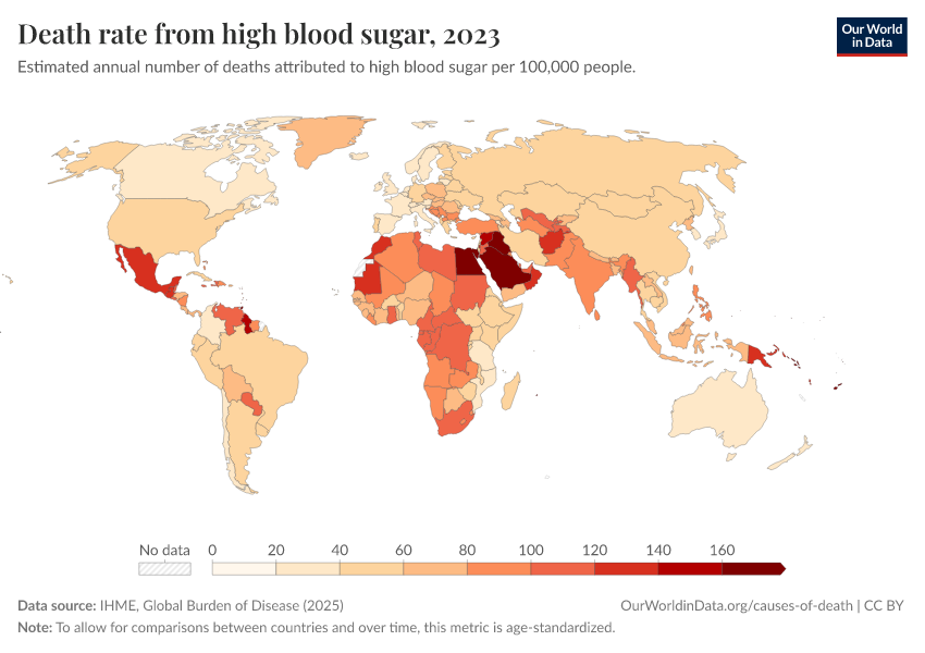 IHME, Global Burden of Disease (2025) – with major processing by Our World in Data. “Death rate from high blood sugar” [dataset]. IHME, Global Burden of Disease, “Global Burden of Disease - Risk Factors - Deaths” [original data]. Retrieved March 1, 2026 from https://update-wdi-2026-02-27.owid.pages.dev:8789/20260213-112438/grapher/death-rates-from-high-blood-sugar.html (archived on February 13, 2026).