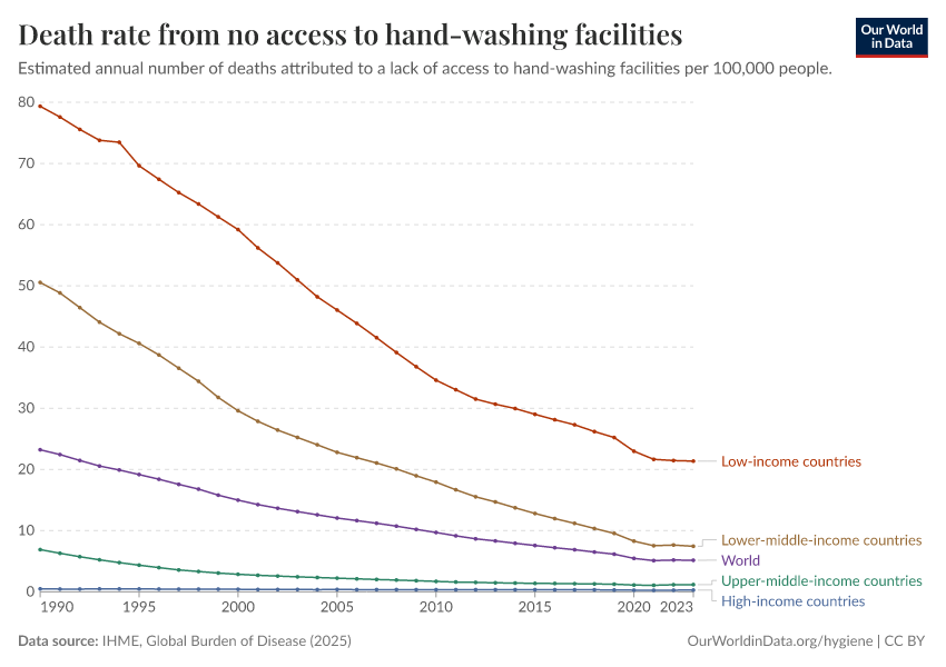 IHME, Global Burden of Disease (2025) – with major processing by Our World in Data. “Death rate from no access to hand-washing facilities” [dataset]. IHME, Global Burden of Disease, “Global Burden of Disease - Risk Factors - Deaths” [original data]. Retrieved March 1, 2026 from https://update-wdi-2026-02-27.owid.pages.dev:8789/20260213-112438/grapher/death-rates-no-handwashing.html (archived on February 13, 2026).