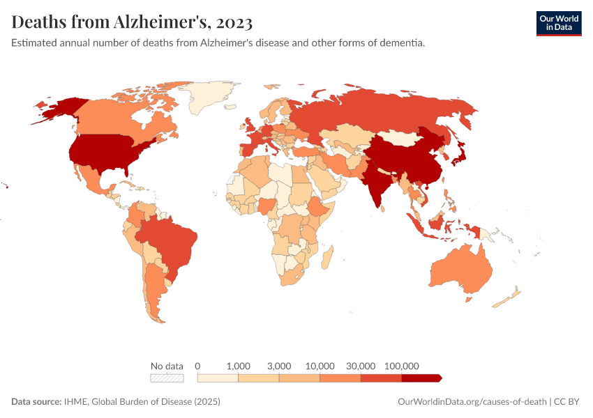 IHME, Global Burden of Disease (2025) – with major processing by Our World in Data. “Deaths from Alzheimer's” [dataset]. IHME, Global Burden of Disease, “Global Burden of Disease - Deaths” [original data]. Retrieved March 1, 2026 from https://update-wdi-2026-02-27.owid.pages.dev:8789/20260211-174736/grapher/deaths-from-alzheimers.html (archived on February 11, 2026).