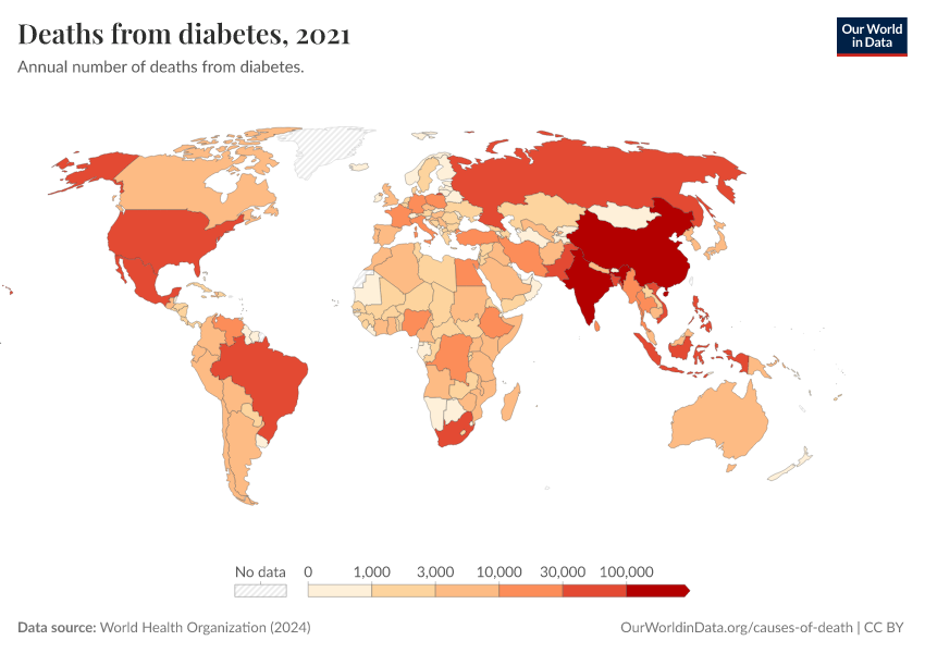 World Health Organization (2024) – with major processing by Our World in Data. “Deaths from diabetes” [dataset]. World Health Organization, “Global Health Estimates” [original data]. Retrieved March 1, 2026 from https://update-wdi-2026-02-27.owid.pages.dev:8789/20250909-093708/grapher/deaths-from-diabetes-ghe.html (archived on September 9, 2025).